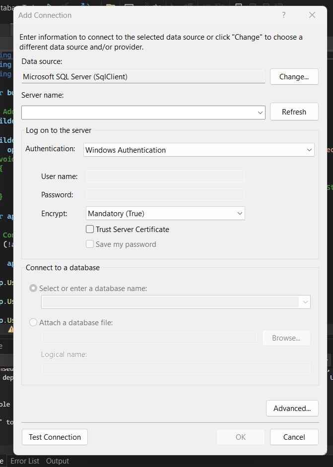Server name kasti pane: (localdb)\MSSQLLocalDB