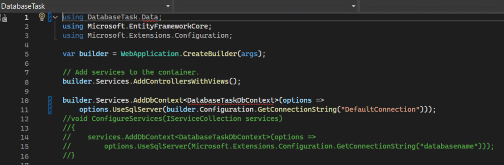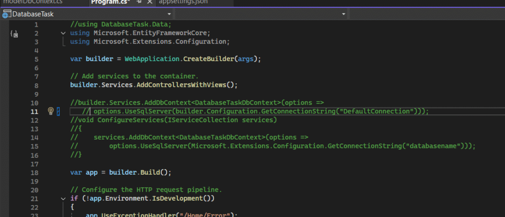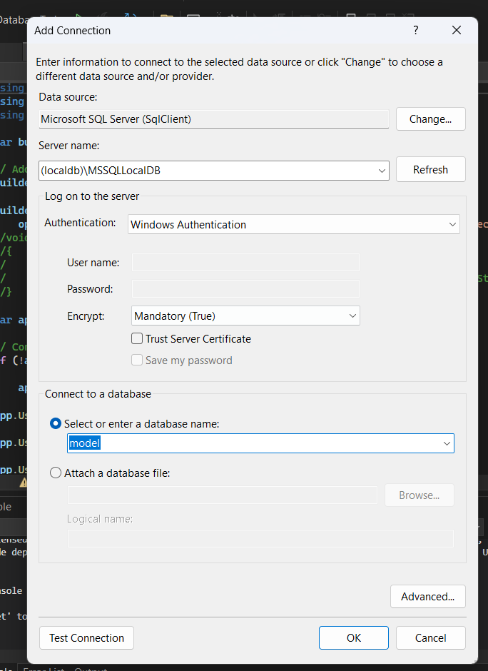 “DefaultConnection”: “Data Source=(localdb)\MSSQLLocalDB;Initial Catalog=model;Integrated Security=True;Trust Server Certificate=True”